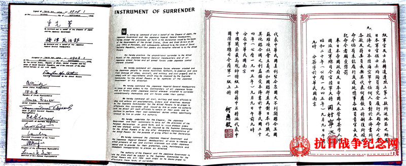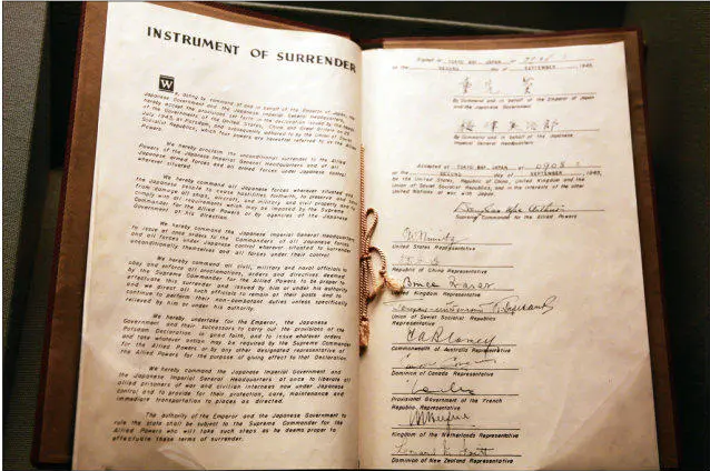 1945年8月15日,裕仁天皇向全国进行广播接受《波茨坦公告》并且颁布无条件投降诏书,宣布向盟国无条件投降。盟军最高司令麦克亚瑟随即率美、中、英、苏、澳、加、法、荷、新等国的代表赴日本受降。签字仪式于1945年9月2日上午九时在美国海军“密苏里”号战列舰上举行。中国代表徐永昌上将在商震将军陪同下代表中国在投降书上签字。