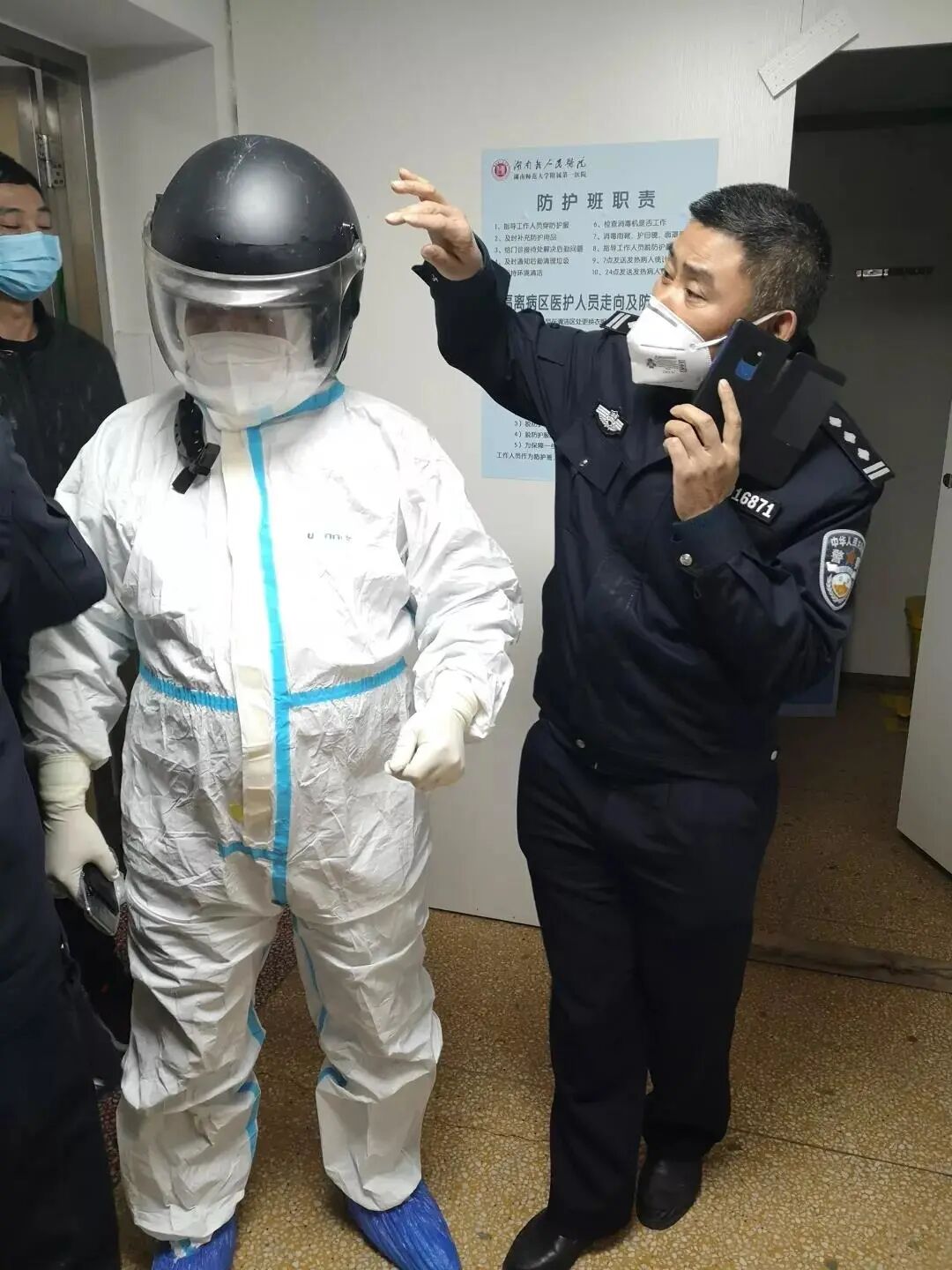 22时30分,为防止患者情绪激动发生意外情况,李方平脱下警服穿上防护服,不顾传染的危险进入留观病房,与患者“零距离”接触进行劝导。