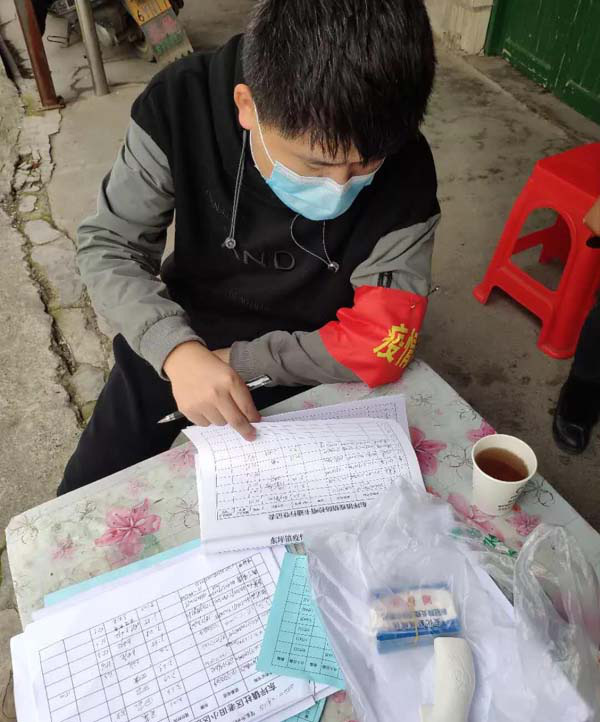 守点工作队员李博、杨启玲、黄杰正在核对登记信息