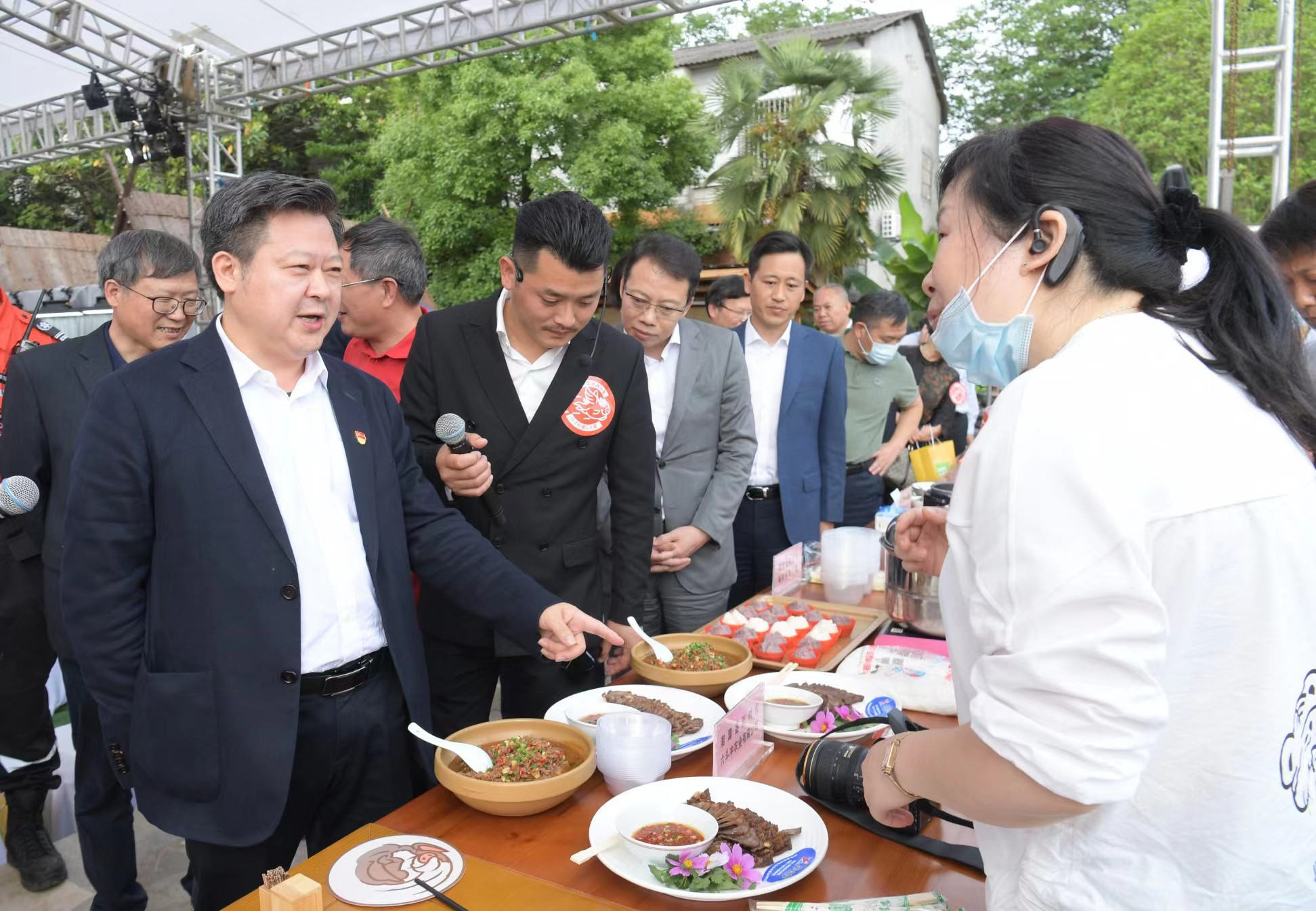 活动现场的美食体验区,红烧肉、莲蓬扣肉等沙子岭猪美食种类繁多,色香俱全。刘志仁、胡贺波等领导走进体验区巡展,了解农产品和沙子岭猪产业情况。