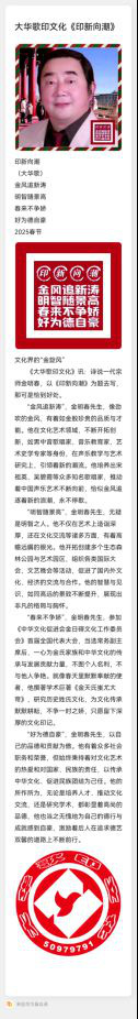 “金风追新涛”,金明春先生,像劲吹的金风,有着如金般珍贵的品质与才能。他在文化艺术领域,不断开拓创新,如男中音歌唱家、音乐教育家、艺术史学专家等身份,在声乐教学与艺术研究上,引领着新的潮流。他培养出宋祖英、吴碧霞等众多知名歌唱家,推动着中国声乐艺术不断向前,恰似金风追逐着新的浪潮,永不停歇。